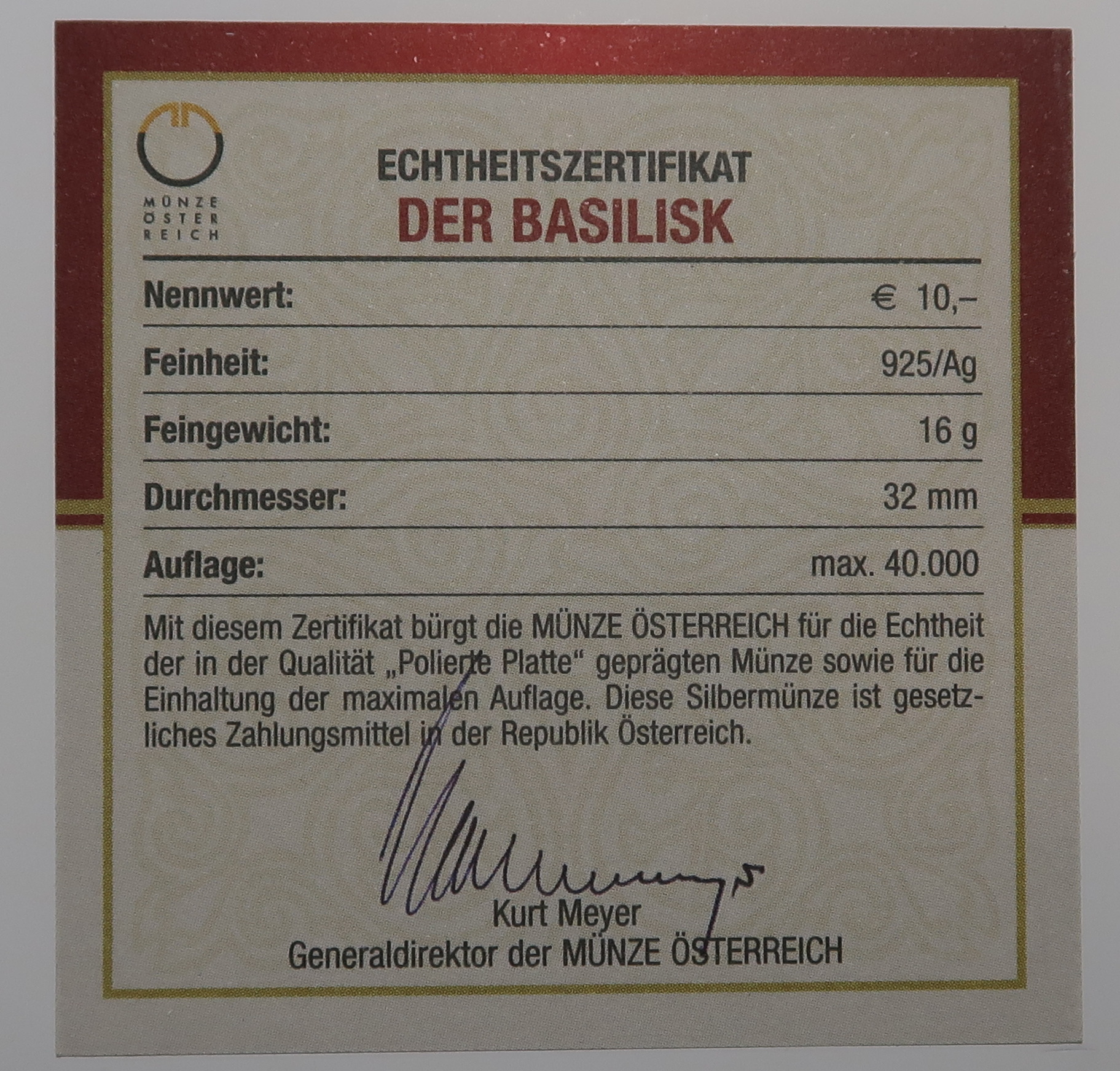 AUSTRIA : SILVER PROOF 10 EURO 2009. DRAGON OF VIENNA.