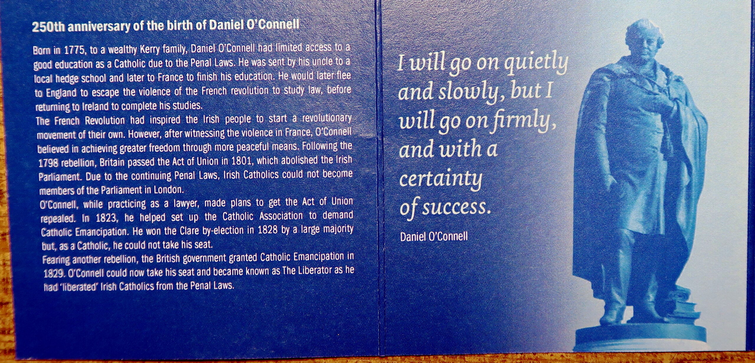 ISSUED TO COMMEMORATE THE 250TH ANNIVERSARY OF THE BIRTH OF O’CONNELL.