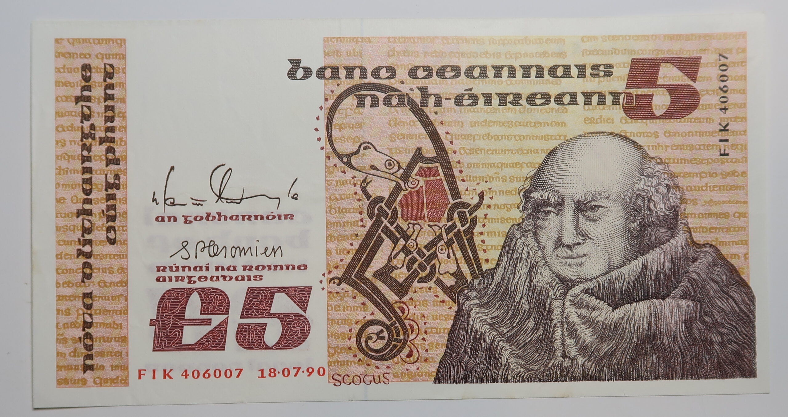 Home / Irish Banknotes / IRELAND FIVE POUND NOTE 18.7.1990. B.SERIES .