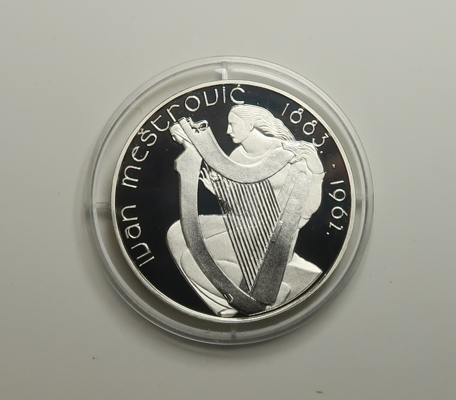 THE COIN CELEBRATES IVAN MESTROVIC WHO SUBMITTED A DESIGN FOR THE FIRST COINAGE OF THE NEW IRISH FREE STATE IN 1927. HIS DESIGN FEATURING A WOMAN WITH HARP ARRIVED TOO LATE FOR CONSIDERATION. HOWEVER, THE DESIGN WAS SUBSEQUENTLY ADOPTED BY THE IRISH CENTRAL BANK AS ITS OFFICAL SEAL.