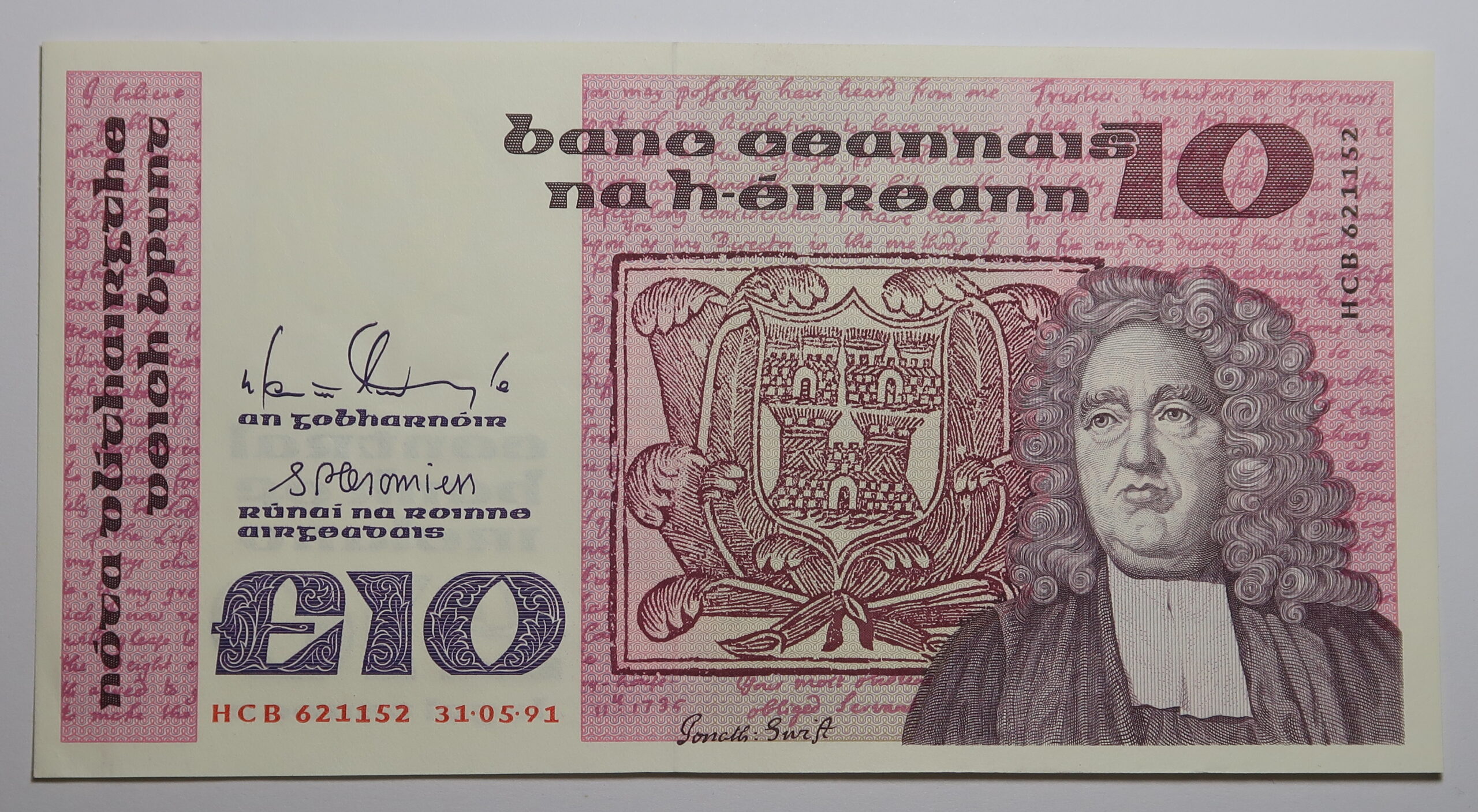 IRELAND TEN POUND NOTE 31.5.1991. B.SERIES . JONATHAN SWIFT.