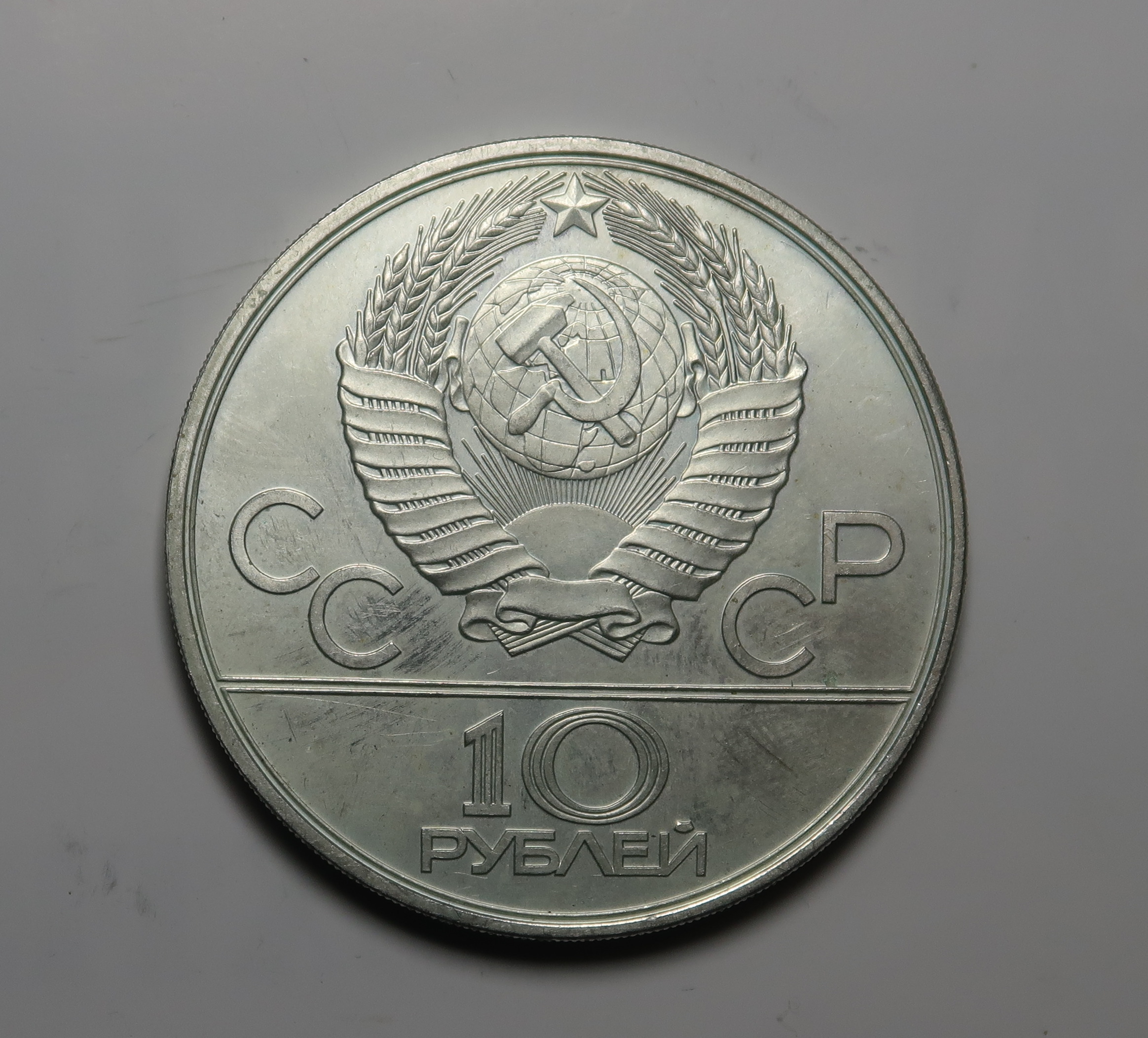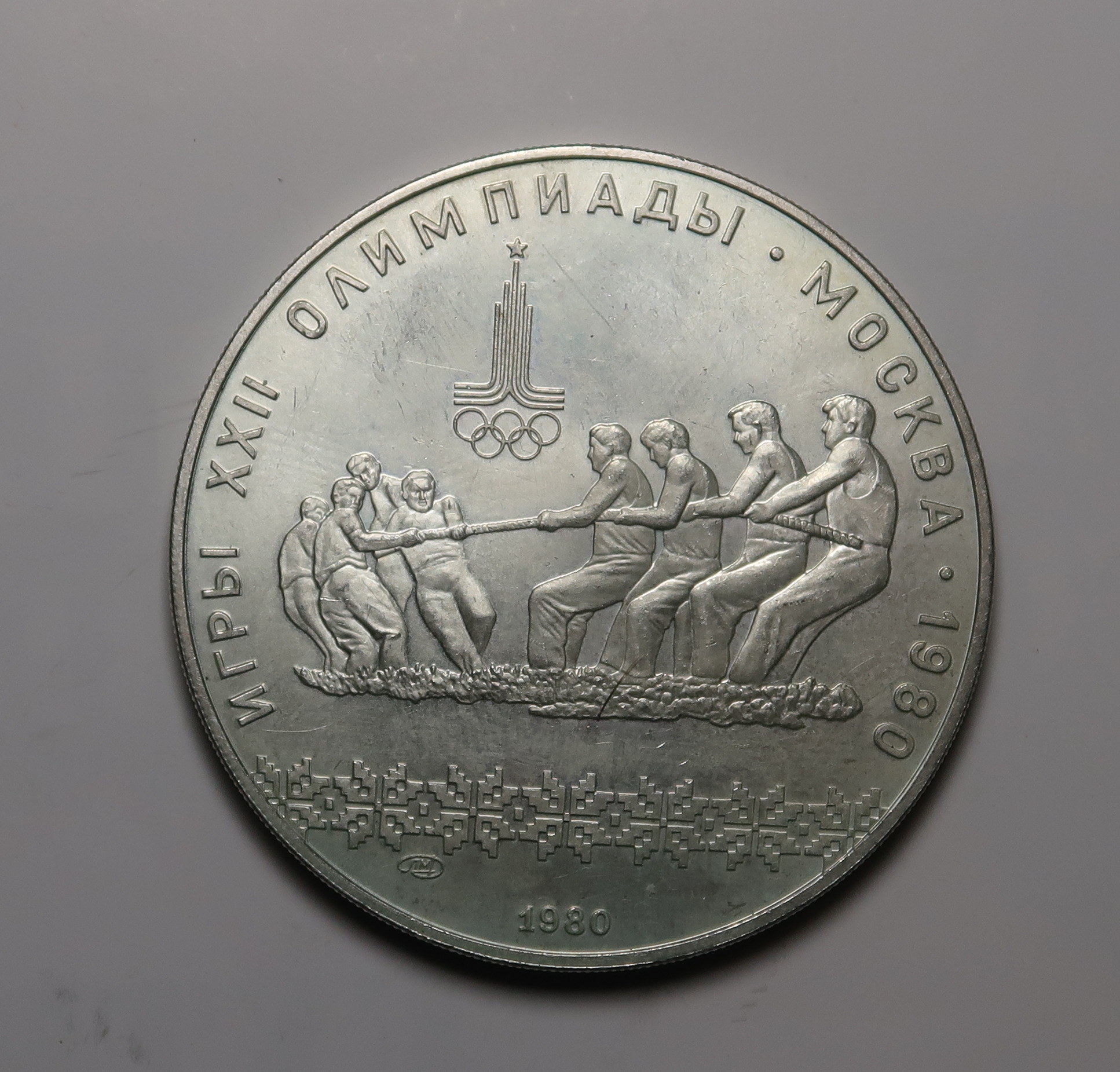 RUSSIA : SILVER 10 ROUBLES 1980. TUG OF WAR. MOSCOW OLYMPICS.